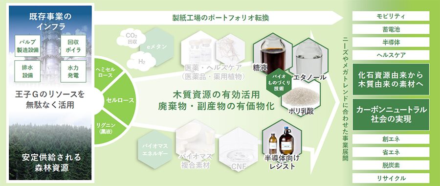 近年、化石資源に依存しないバイオ由来化学品の商用化を目指す動きが活発化している中、王子グループが持つ、豊富な森林資源を活用して、バイオ燃料やバイオプラスチックを製造する取組みを進めています。