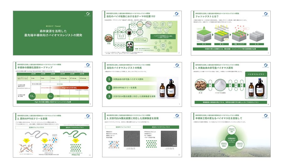 AIや自動運転車などの分野でますます市場が拡大している半導体市場では、より高性能で価値の高い半導体の原料が求められています。その中で、当社が開発している「木質由来のバイオマスレジスト」は、木質バイオマス材料がレジストの原料として使用される一方で、人体への影響が懸念される「PFAS」を含まず、次世代EUV露光装置にも対応した高解像度のパターン形成が可能で、次世代の半導体製造に適した材料とされています。