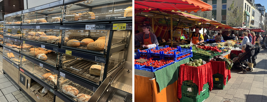 (左)スーパーマーケットに並ぶ豊富な種類のパン/(左)Dürenの市場