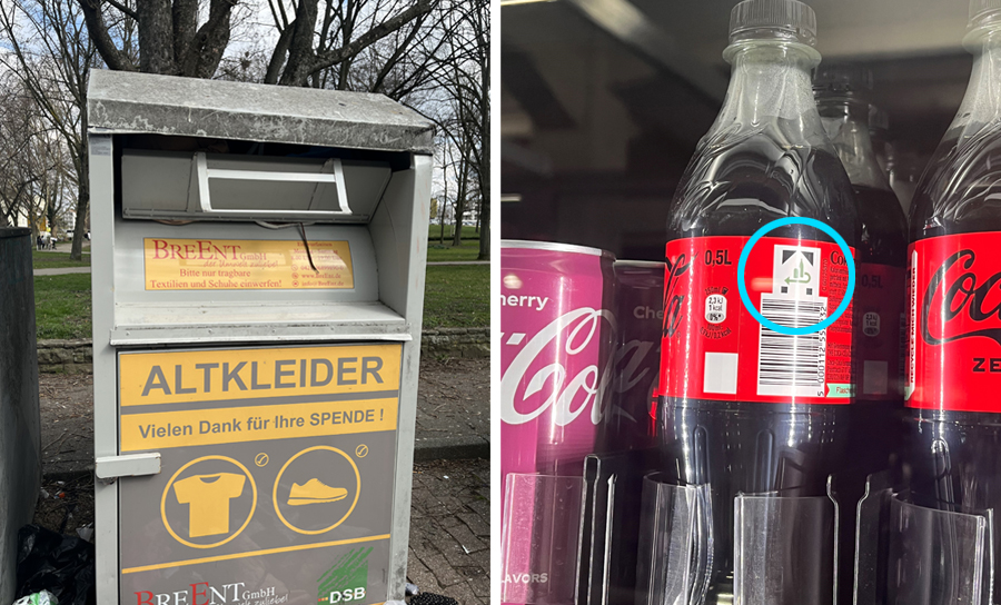 (左)衣類回収ボックス/(右)返却時に割引又は返金を受けられる製品についているPfandマーク