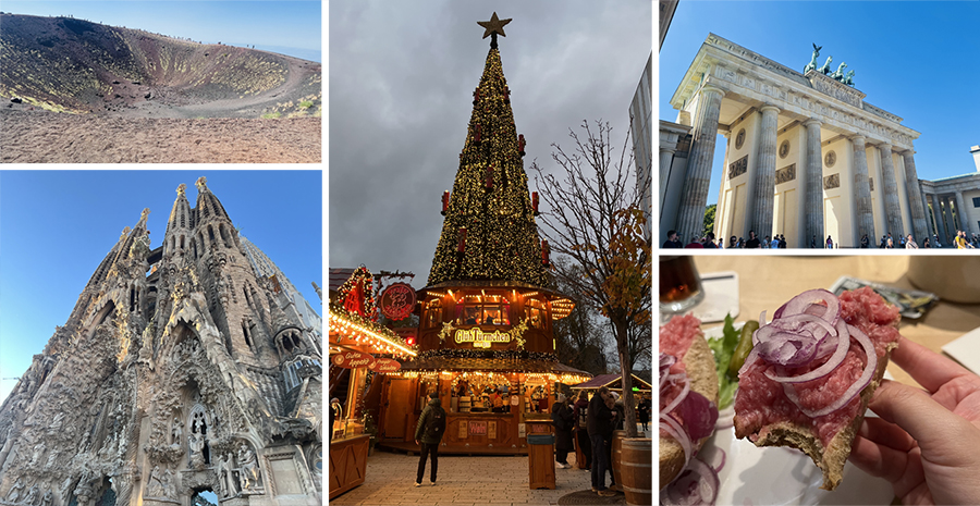 (左上)シチリア島のエトナ山/(左下)バルセロナのサグラダファミリア/(中央)デュッセルドルフのクリスマスマーケット